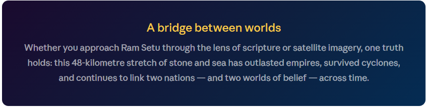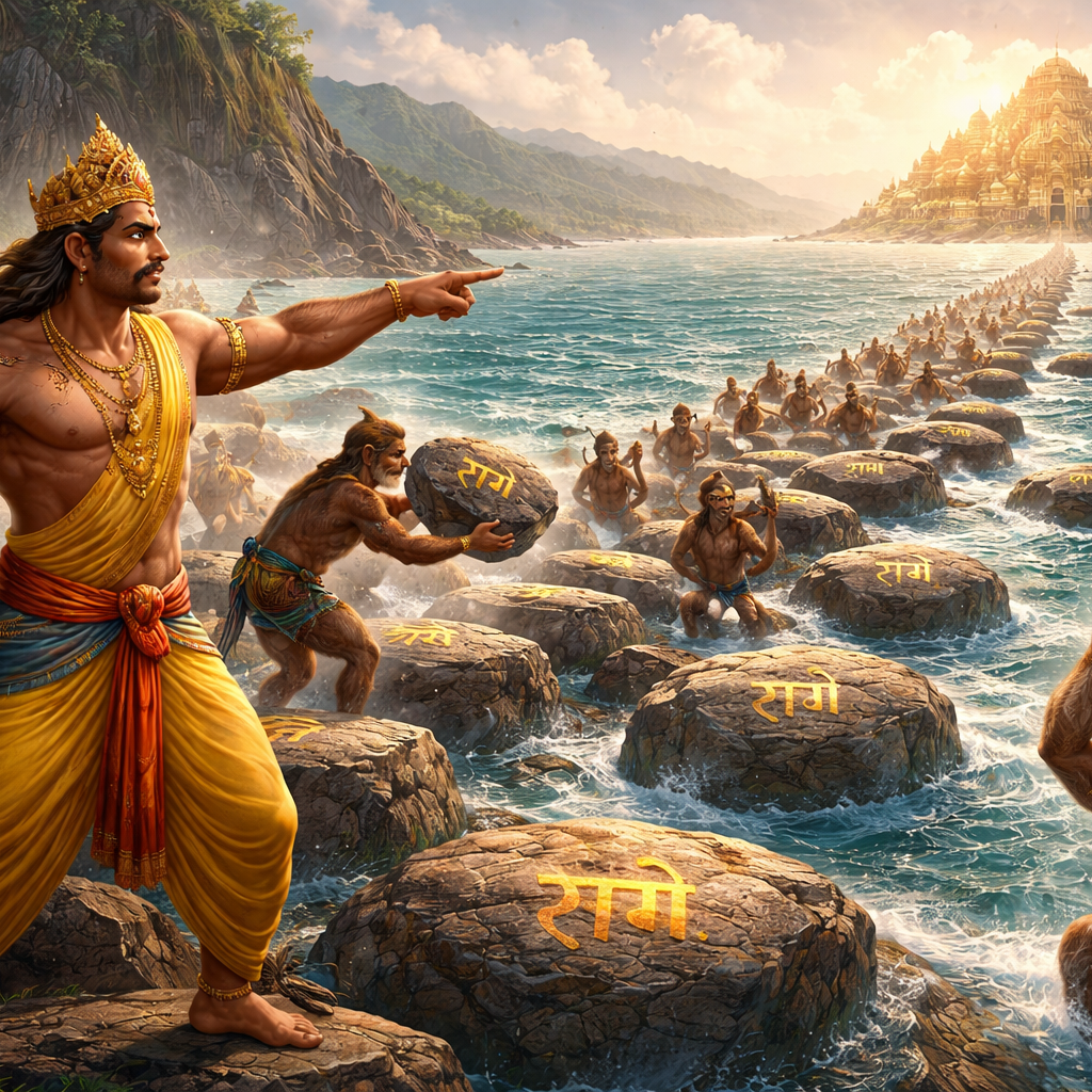 |”In Valmiki’s Ramayana, the bridge is described as Sethubanthan — the binding of the sea. Devotion, tenacity, and divine intervention were its pillars.”